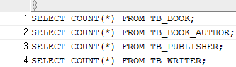 -- 1. 4개 테이블에 포함된 데이터 건 수를 구하는 SQL문 생성 구문 작성