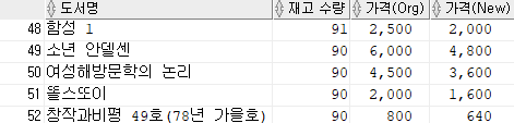 -- 결과 헤더는 "도서명", "재고 수량", "가격(Org)", "가격(New)"로 표시한다.
