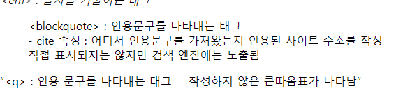 - 시작태그 내에 cite 속성을 쓸 수 있다. cite 속성은 인용한 사이트 주소를 속성값으로 갖는다.