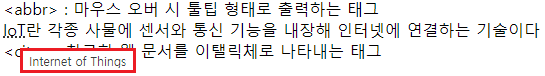 - 시작태그에서 title 속성 통해 풀네임 혹은 보여줄 내용을 명시하고, 이에 대한 약어를 내부문자로 작성한다.