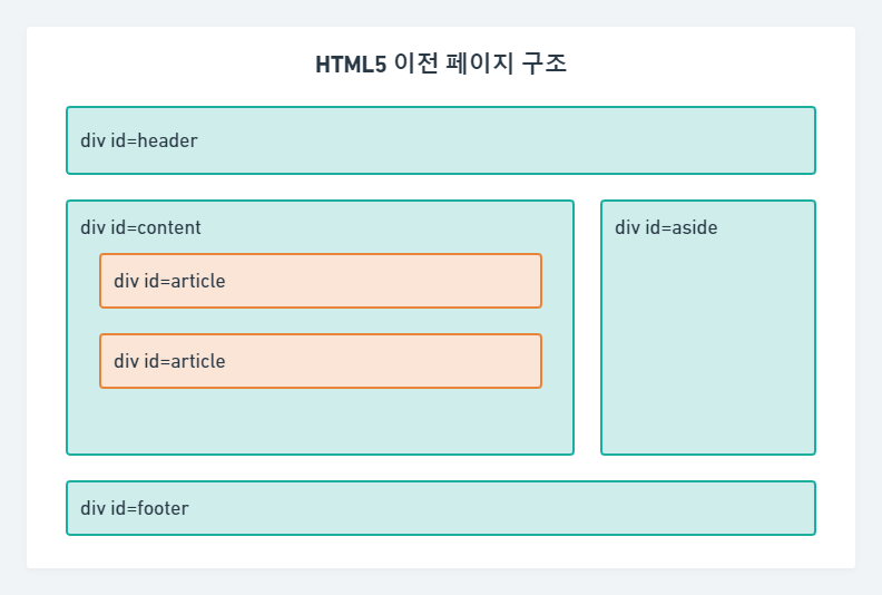 - HTML4, 즉 HTML5 이전 페이지 구조는 위와 같다. <div>, <span> 태그를 이용해 구역을 설정하고, 모든 태그마다 id를 부여해 구분했다.