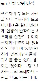 ❗ 직전에 다룬 { text-align: justify; }는 양쪽 정렬 중 자간 간격 또한 임의대로 변경하므로 자칫 가독성을 해칠 수 있다.