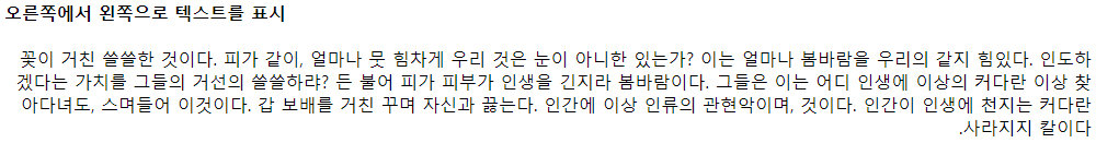 - 그 반대인 rtl은 right to left로서 오른쪽에서 왼쪽으로 나타낸다.
