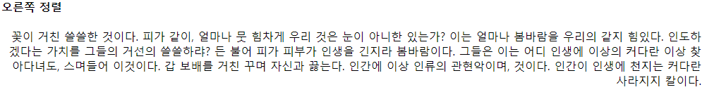 end | 현재 텍스트 줄의 끝 위치 따라 문단 정렬 ※ ltr/rtl 여부 확인해 맞춤 정렬함 |
