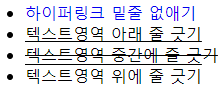 - 그밖에도 텍스트 아래 밑줄 긋는 underline, 텍스트 중간에 취소선을 만드는 line-through, 텍스트 영역 위에 줄이 생기는 overline이 속성값 선택지로 있다.