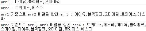 - 한편, 문자열과 더해지면 내장된 toString()이 자동 호출돼 콤마(,) 기준으로 합쳐진 문자열로서 반환된다.