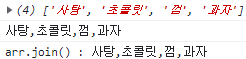 | 배열명.join(구분자) | 구분자로 결합하여 문자열로 반환 |