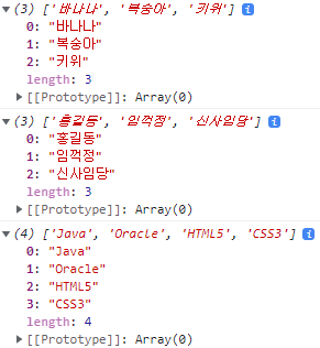 let arr3 = new Array('홍길동', '임꺽정', '신사임당'); //숫자 대신 데이터를 전달해 초기화
