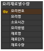 요리재료별수량 엔티티에서 주식별자를 찾는다. 예시에서는 재료명을 택했으나, 마땅한 속성이 없다면 '재료번호'를 별도로 추가할 수도 있다.
