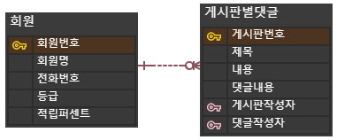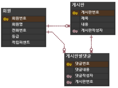 댓글이 달릴 때마다 새로운 댓글번호가 할당돼 구별되도록 인위적 주식별자 '댓글번호'를 추가한다. 이때 게시판별댓글이므로 게시판 엔티티와 비식별 관계가 정의되어야 한다.