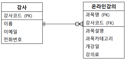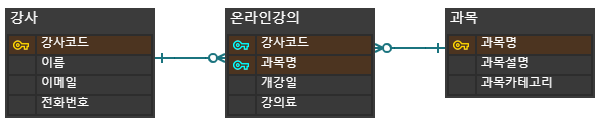 과목설명, 과목카테고리 속성은 과목명만으로 알 수 있다. 이들처럼 종속되는 속성들은 부모 엔티티로 따로 뽑아낼 수 있게 된다. 하지만 개강일 및 강의료는 A강사가 담당할 때와 B강사가 가르칠 때 다를 수 있다.