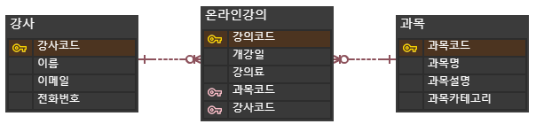 과목설명, 과목카테고리 속성은 과목명만으로 알 수 있다. 이들처럼 종속되는 속성들은 부모 엔티티로 따로 뽑아낼 수 있게 된다. 하지만 개강일 및 강의료는 A강사가 담당할 때와 B강사가 가르칠 때 다를 수 있다.