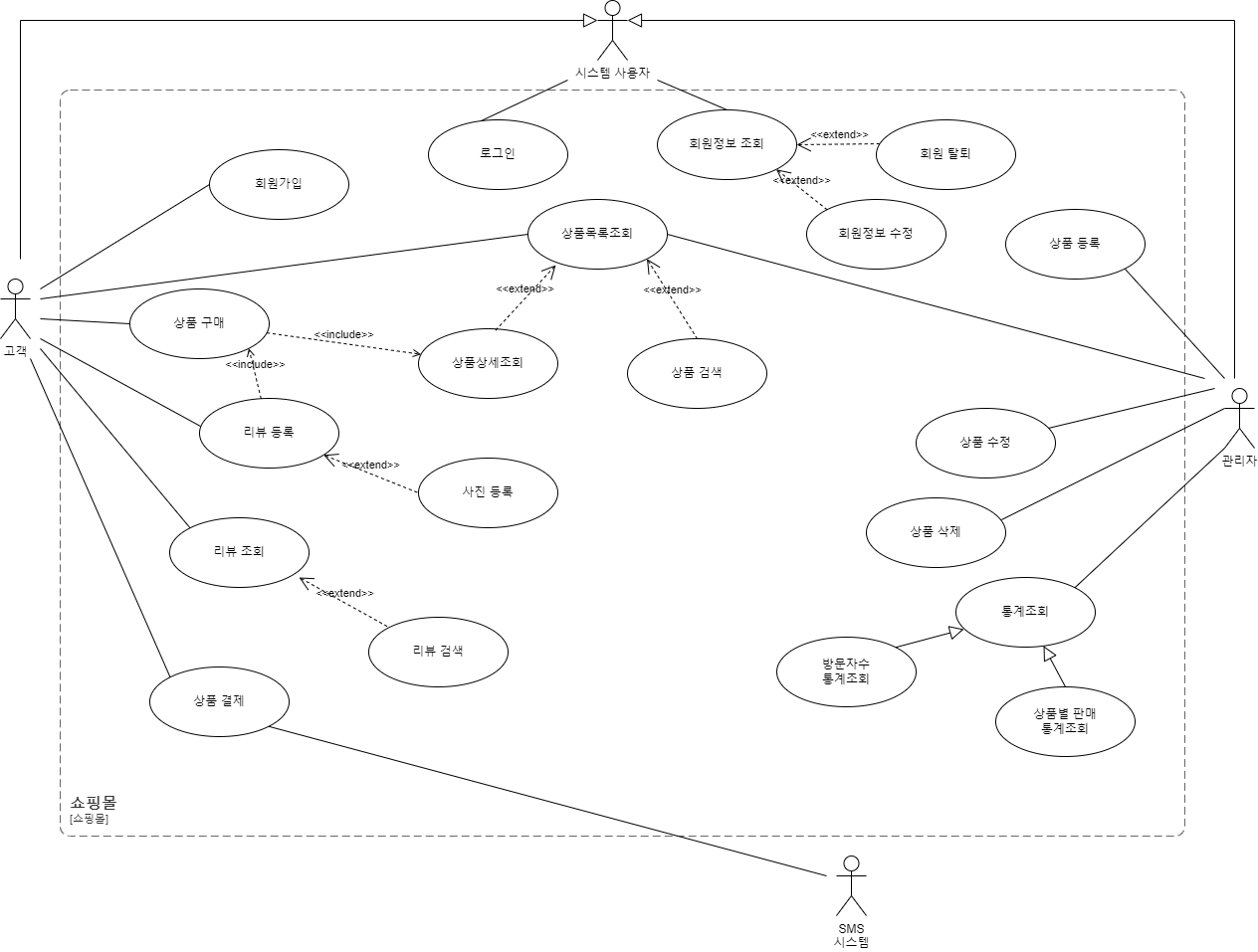 상품 목록 조회는 고객과 관리자 모두 가능하다고 했다. 따라서 두 액터와 직접 연결 짓고, 비단 목록 조회에 그치는 것이 아니라 상품검색(extend)도 상품상세조회(extend)도 확장 관계로 둔다.
