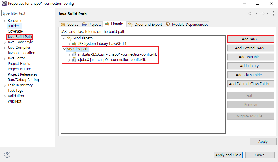 - ④ 프로젝트명 → (우클릭) → Properties 창을 띄워 Java Build Path의 Libraries를 설정한다. Classpath를 선택하고, Add JARs... 버튼을 눌러 사용하고자 하는 라이브러리 파일 모두를 등록한다.