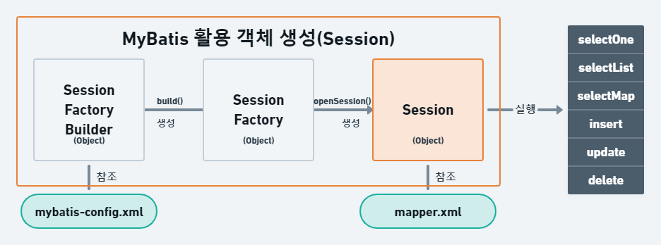 - SqlSessionFactoryBuilder의 경우 SqlSessionFactory 인터페이스 타입의 하위 구현 객체를 생성하기 위한 빌드 역할 수행한다.
