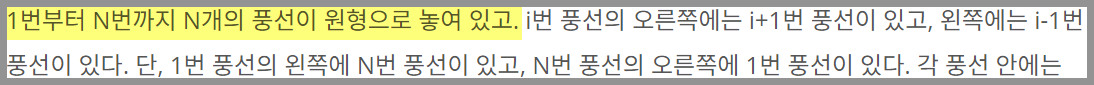 1번부터 N번까지 N개의 풍선이 원형으로 놓여 있고. i번 풍선의 오른쪽에는 i+1번 풍선이 있고, 왼쪽에는 i-1번 풍선이 있다. 단, 1번 풍선의 왼쪽에 N번 풍선이 있고, N번 풍선의 오른쪽에 1번 풍선