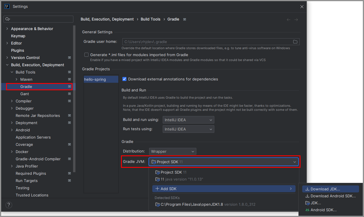 - Settings → Build, Execution, Deployment → Build Tools → Gradle에서 Gradle JVM을 17 버전으로 변경한다.