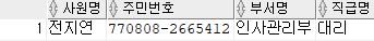 -- 성이 전씨인 직원들의 사원명, 주민번호, 부서명, 직급명을 조회하세요.