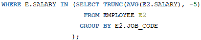 WHERE (E.JOB_CODE, E.SALARY) IN (SELECT E2.JOB_CODE -- 비교연산자 IN 사용
