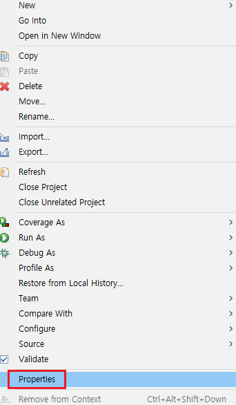 - 라이브러리추가①. 프로젝트명에서 우클릭 → Properties 선택한다.
