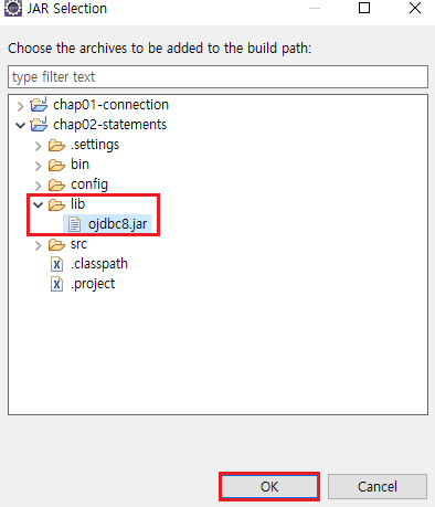- 라이브러리추가③. 실행된 JAR Selection 창에서 저장해둔 lib 폴더 하위의 ojdbc8.jar 파일을 선택하고 OK 누른다.