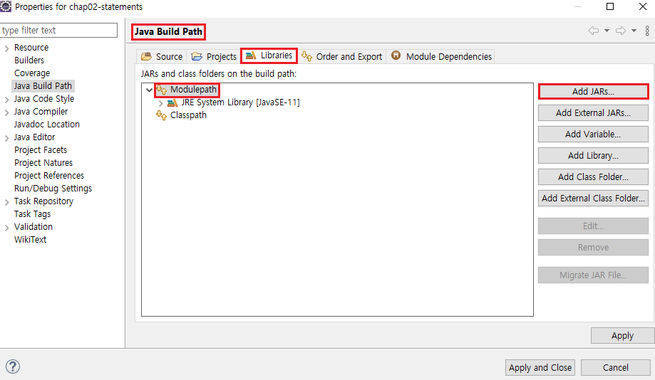 - 라이브러리추가②. Java Build Path → Libraries → Modulepath → Add JARs... 선택한다.