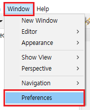 - 문자셋설정①. 상단 바에서 Window → Preferences 클릭한다.