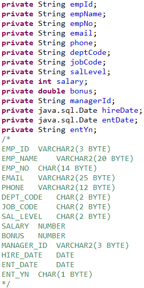 - DTO 클래스는 EMPLOYEE 테이블의 컬럼 데이터를 옮겨담을 ① 각각의 private 필드, ② 기본 생성자와 매개변수 있는 생성자, ③ 설정자(setter)와 접근자(getter), ④ 오버라이딩 된 toString() 메소드로 구성된다.