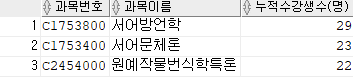 -- 문제가 되고 있다. 최근 3년을 기준으로 수강 인원이 가장 많았던 3과목을 찾는 구문 작성